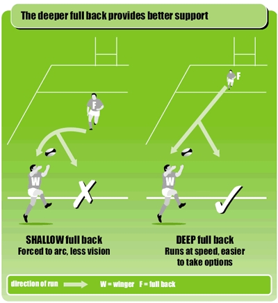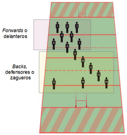 Els backs o defenses són set jugadors que se situen darrere de l’equip. Són els jugadors més àgils i ràpids. Un medio melé, una obertura, dos centres i un ala o wing formen una línia diagonal. Paral·lel a l’ala se situa un altre, i entre mig d’ells, al fons del tot un fullback o zaguero.